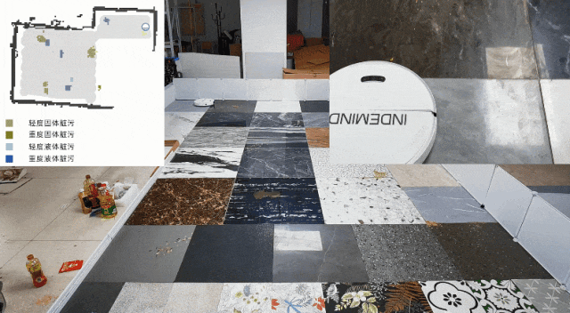在空间感知层面,机器人能实时捕捉前向10-30cm、宽度40cm范围内的空间细节,精准识别固体(饼干渣、灰尘)、液体(咖啡渍、酱油)、粉末(面粉、爽身粉)、固液混合(酱汁、粥渍)四类脏污,且各类脏污的检出率和召回率均≥95%——即便是透明的水渍,这一能力在行业内独一无二。